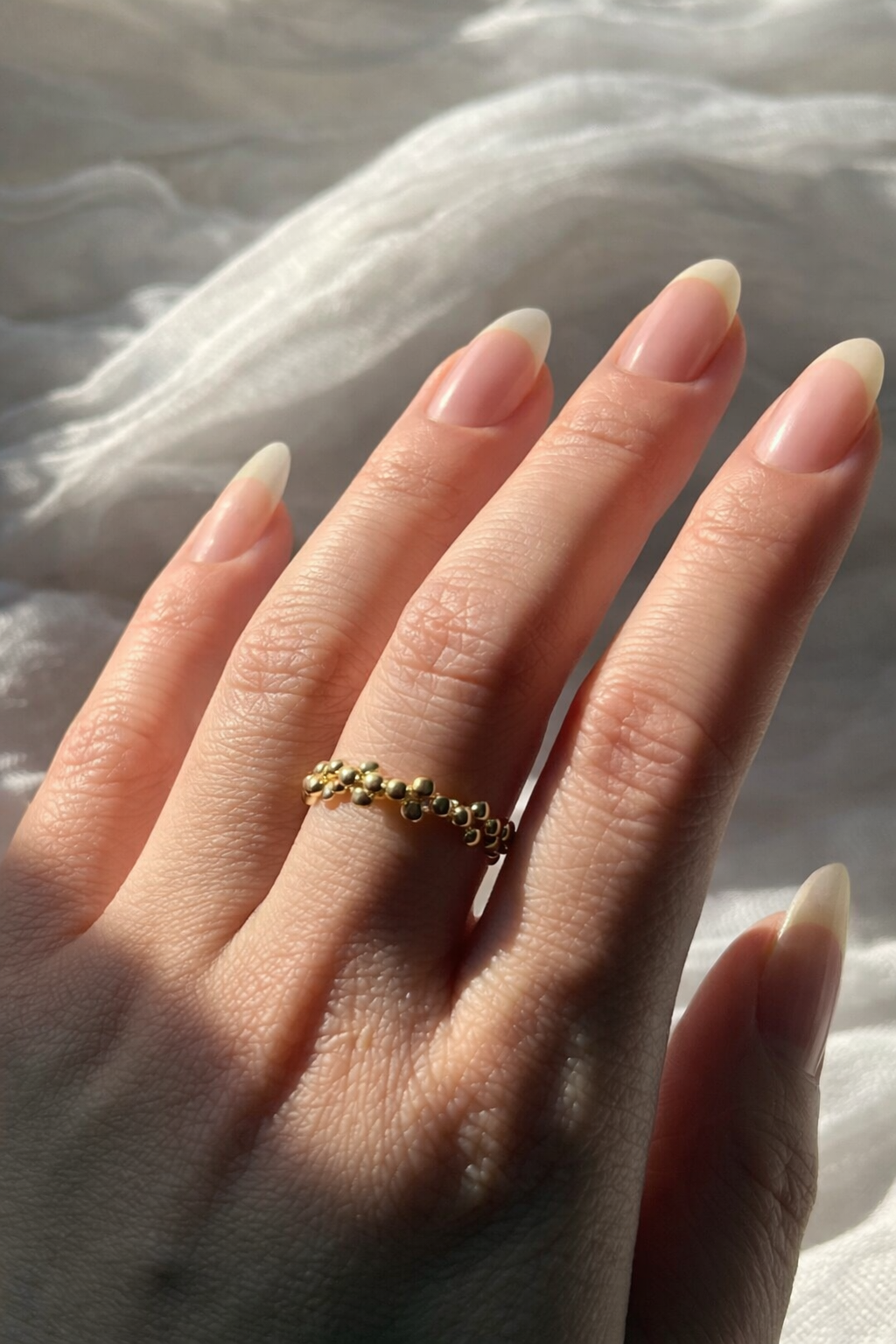 Our Golden Cluster Ring is a delicate handmade band crafted with shimmering 11/0 ToHo golden beads, carefully strung on durable fishing line to create a light, sun-like glow.